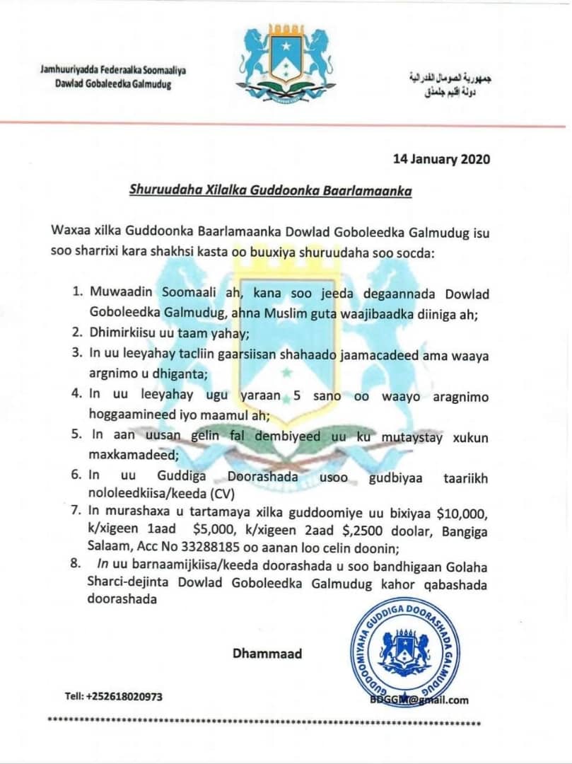 Hoos ka akhriso shuruudaha xilka guddoonka baarlamaaka Galmudug.