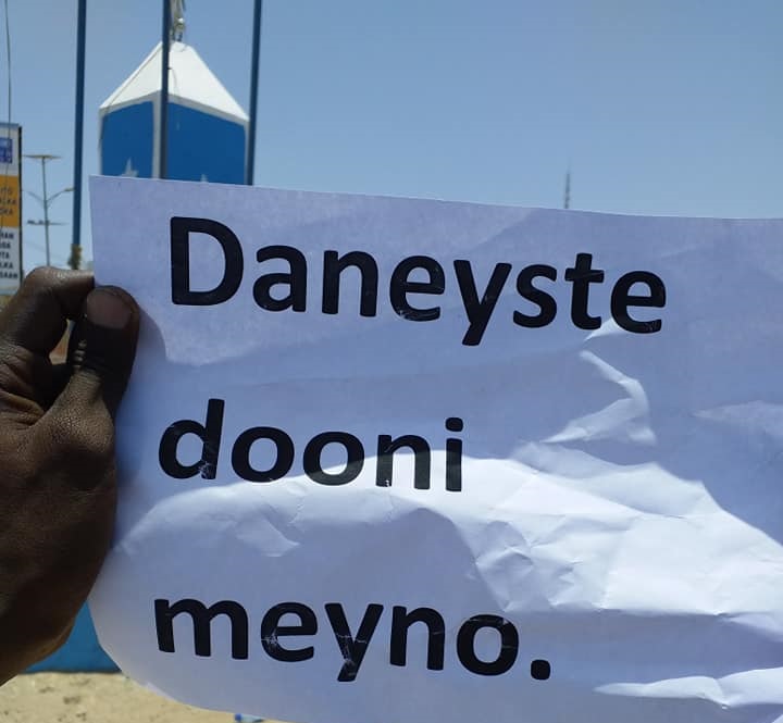 Dhanka kale isla Dhuusamareeb waxaa ka dhacay dibadbax kan Ahlu sunna ka yaraa oo lagu taageeray ra’iusul wasaare Kheyre, waxaana ku qornaa boorarka“dowlad diid doonimeyno”, “daneyste doonimeyno”.