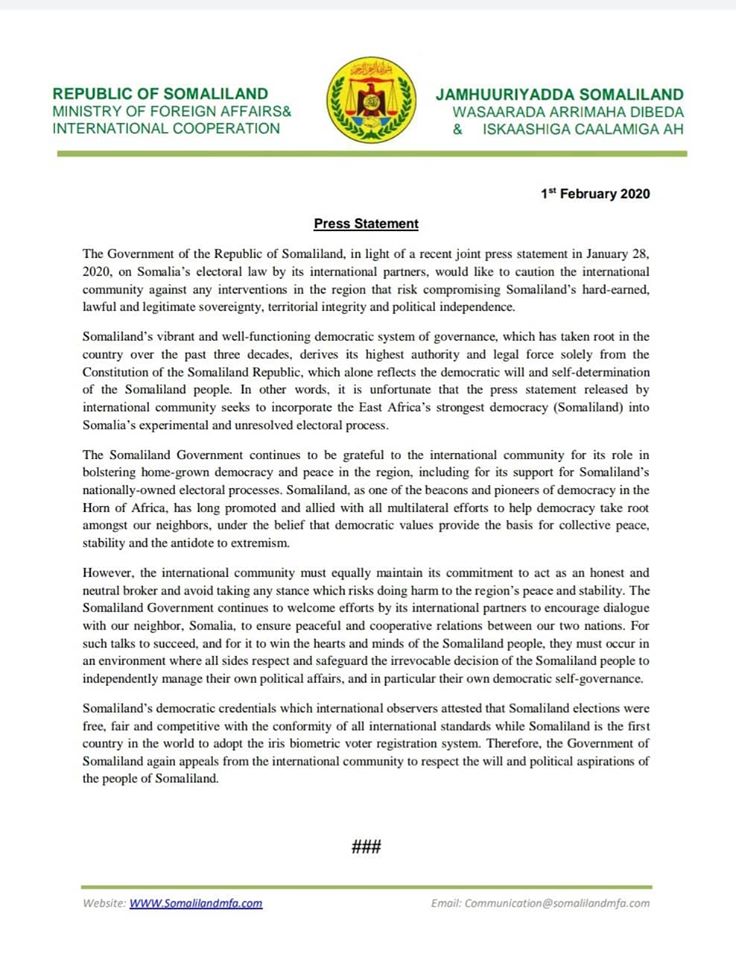 Wasaarada arrimaha dibeda Somaliland, ayaa digniintaasi Beesha caalamka ugu dirtay War-saxaafadeed ay maanta soo saartay, kaasi oo ay jawaab kaga bixinaysay war-saxaafadeedkii wada-jirka ahaa ee ay soo saareen Guddida doorashooyinka ee Soomaaliya iyo beesha caalamka 28-kii Bishii Janaury, 2020-kii.
