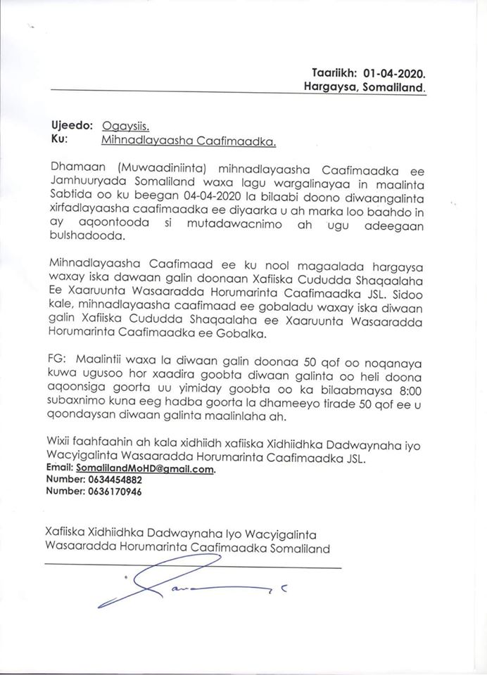 Somaliland ayaa sheegtay inay maalinta Sabtida oo ay taariikhduna ku beegan tahay 4-ta bisha April, la diiwaan-gelin doono Mihnadlayaasha caafimaad, gaar ahaan kuwa ku nool magaalada Hargeysa oo ah halka ay dadka ugu badan ee reer Somaliland ay ku nool yihiin.