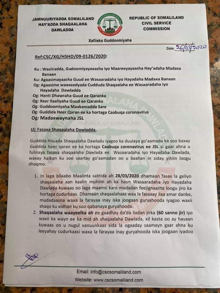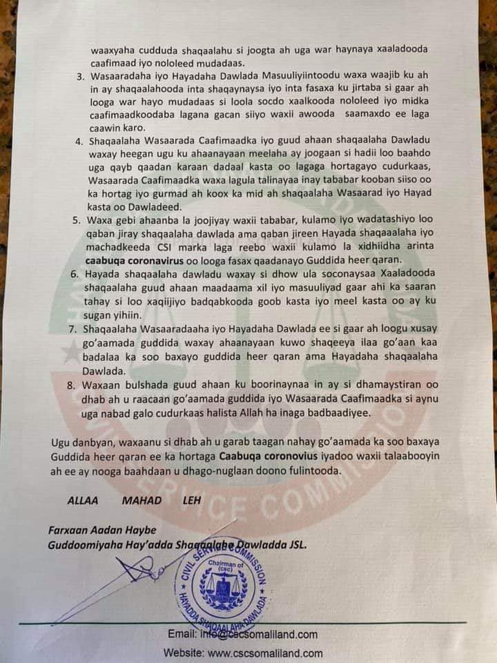 Hargeysa (Caasimada Online) ― Xukuumada Somaliland ayaa maanta soo saartay go’aamo kale oo lagu sii xoojinayo ka hortaga cudurka faraha ba’an ku haya dunida ee Coronavirus.