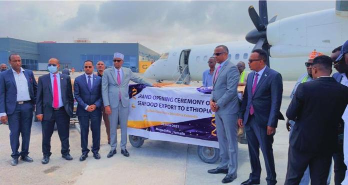 Sidoo kale waxaa isla maanta dalka Ethiopia loo daabulay shixnadii ugu horeeysay ee Kalluunka Soomaaliya, kaasi oo ahaa 20,000 oo Tan, waxaana lagu raray labo kamid ah diyaaradaha Shirkada Ethiopian Airlines oo isla maanta Qaad kasoo dejisay garoonka Muqdisho.