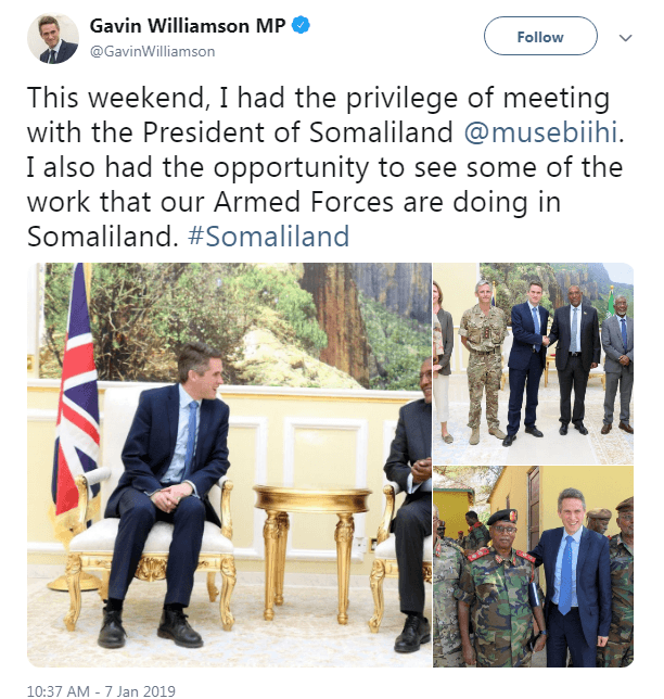 London (Caasimada Online) – Wasiirka gaashaandhigga UK, Gavin Williamson, ayaa tiray qoraal uu soo dhigay twitter-ka oo uu Somaliland ugu yeeray dal, wuxuuna soo dhigay qoraal kale.
