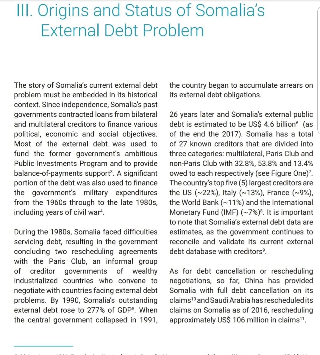 Ma jirto dowlad deyn ku leh Soomaaliya, oo balan qaadey deyntii ay lahayd in ay Soomaaliya, ka cafinayso. Waxa socda waa dulsaarkii deynta in meel la saaro.