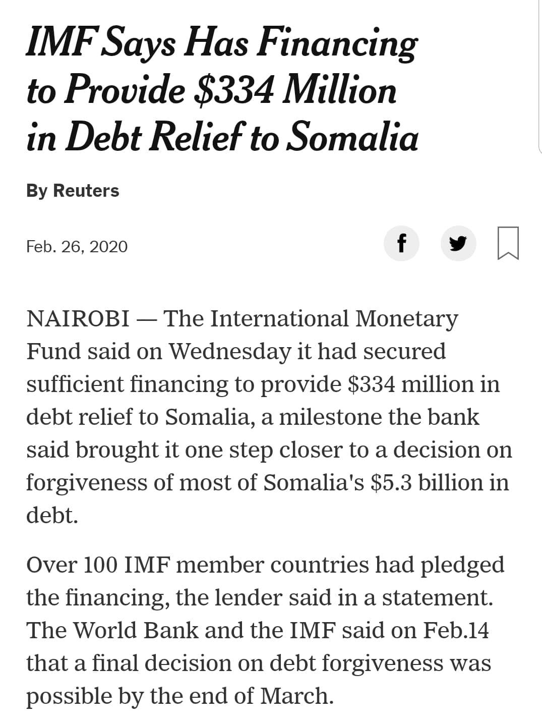 Shukaansigii waa uu mira dhalayaa oo boqol (100) xubnood oo dowladaha xubnaha ka ah IMF, ayaa aqbalay in ay dulsaarkii iyo khidmadii IMF iyo WB, baxshaan si dhabaha loogu xaaro in Soomaaliya, deymihii hore laga cafiyo.
